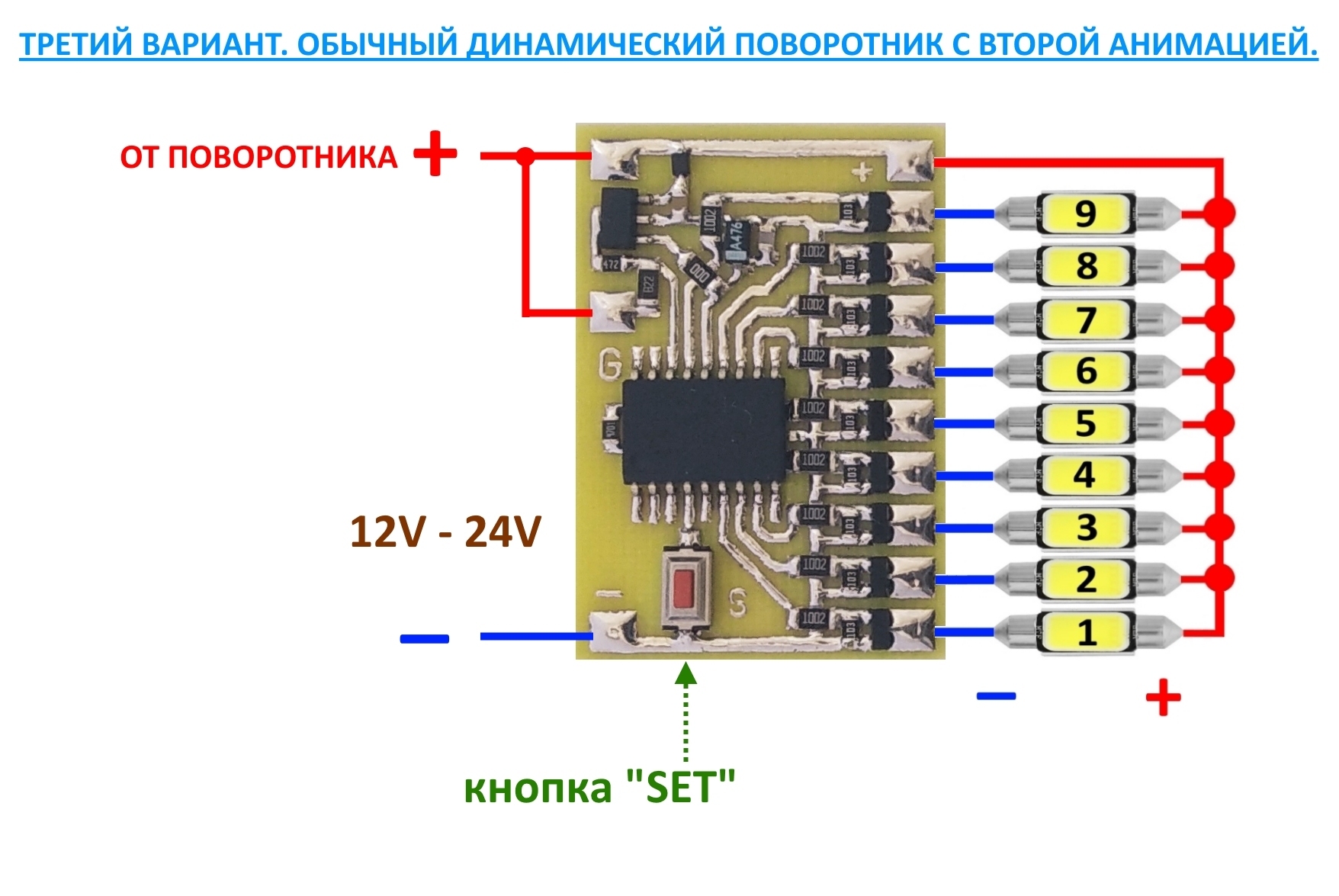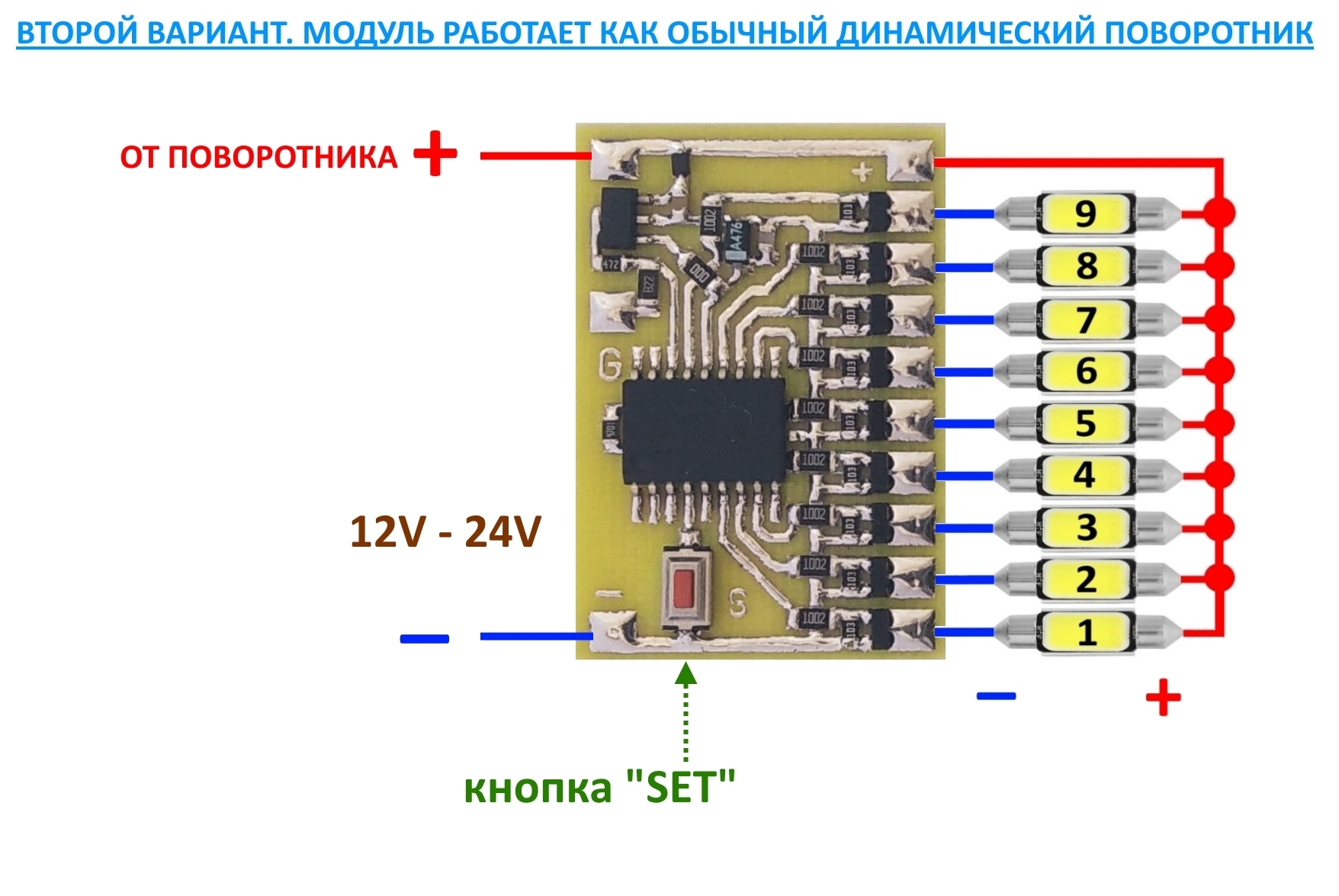 Даний модуль модуль змінює динамічний спецефект залежно включені габарити чи ні. Коли габарити (або фари) вимкнені, і вмикаєте поворот - то програється перша класична анімація поворотника. Якщо габарити включені і включає поворот - то вже програється друга анімація поворотника. За бажання даний модуль можна підключати і за класичною схемою (другий і третій приклад підключення), але в цьому випадку анімація повороту не змінюватиметься залежно від того, чи включені габарити чи ні. У всіх трьох варіантах підключення додаткових проводів тягнути не треба, адже додаткового проводу живлення модуль не потребує. Модуль дуже компактний і з легкістю вміститься усередині будь-якого стопа. А також за допомогою налаштувань можна "віддзеркалити" анімацію, це теж дуже полегшує встановлення модуля.