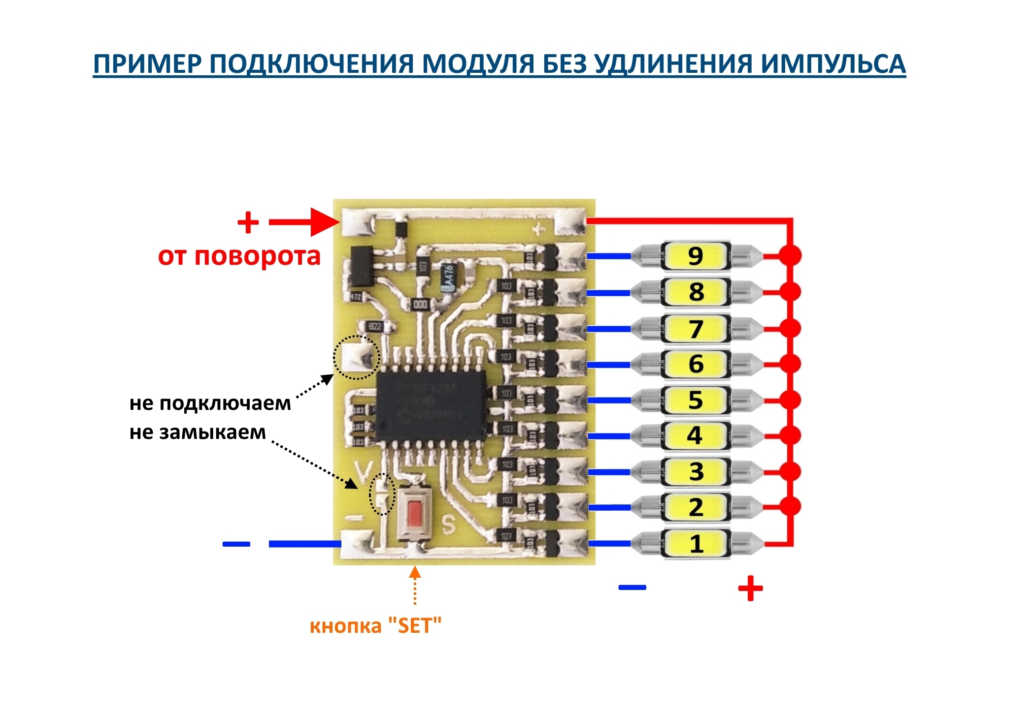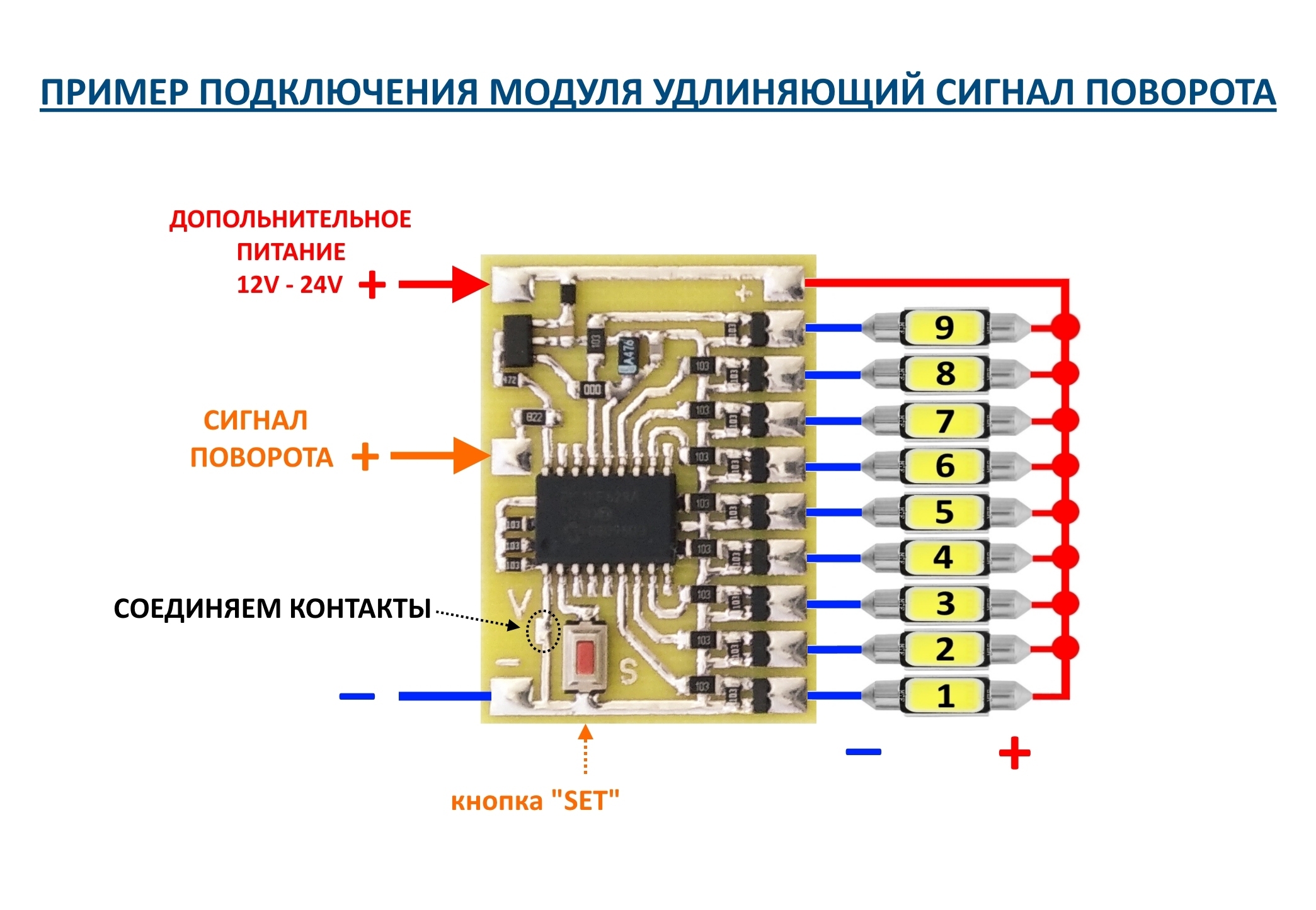 Нова версія динамічного поворотника у стилі все в одному. Цей модуль розроблений спеціально для тих автомобілів, у яких довжина імпульсу короткий або дуже короткий, і при цьому зазвичай в цих автомобілях немає можливості перепрошити ЕБУ або взагалі немає реле поворотів. І хто намагався встановити на такі автомобілі динамічні поворотники знають чим це закінчується - розчаруванням, адже ефект занадто швидко повинен пробігти, око майже не помітить ефект, а про "фіксацію" ефекту наприкінці взагалі мовчу - це просто неможливо реалізувати через короткий імпульс. Для усунення всіх цих проблем знадобляться саме такі модулі. У модулі застосований спеціальний адаптивний алгоритм прошивки по обробці сигналу, щоб можна було використовувати даний модуль з імпульсами абсолютно будь-якої довжини, і при цьому ви можете самі підібрати одну з 9 швидкостей виконання динамічного ефекту. Модуль крім динамічного ефекту вміє сам "фіксувати" спецефект наприкінці, і навіть сам регулює паузу вимикання між імпульсами. У модулі є всього один класичний спецефект (лінія, що подовжується). А також модуль можна використовувати як звичайний динамічний поворотник - без подовження імпульсу. Для того щоб перевести модуль у необхідний режим роботи треба всього краплю припою на двох контактах (або прибрати краплю припою), дивіться зображення та відео. До цього контролера можна підключати до 9 світлодіодів, або до 9 ланцюжків світлодіодів. Транзистори на контролері стоять N-канальні, а це означає, що з транзистори на світлодіоди виходять мінуси. Плюс на світлодіоди приходить загальний.