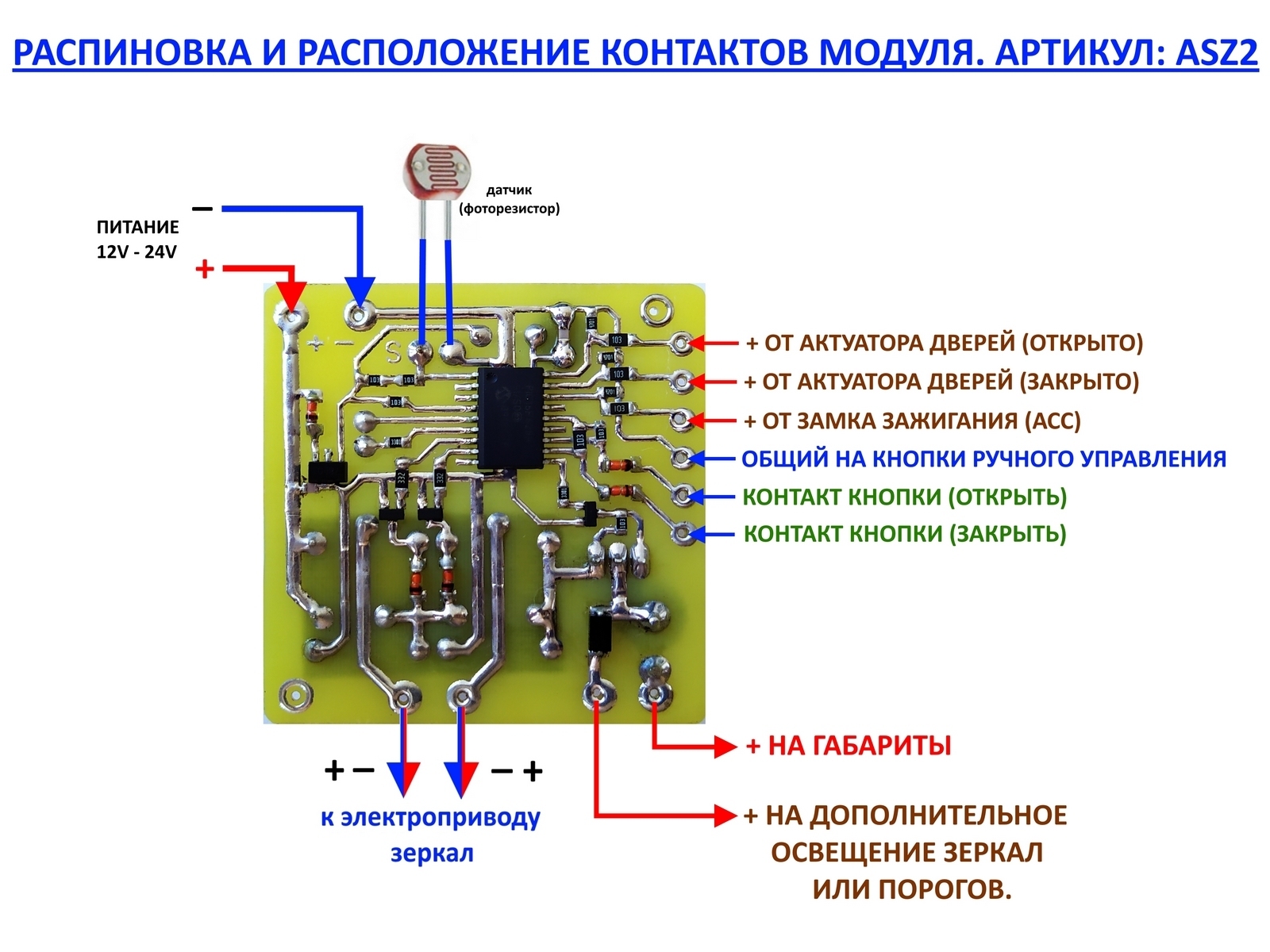 Це універсальний модуль автоматизації процесу складання дзеркал заднього виду, повністю придуманий та розроблений мною. Версія V1 та V2 більше не випускається (артикул: ASZ2, не змінився). У цій новій версії V2.1 модуля додано нові функції. Модуль універсальний і застосовуємо у всіх автомобілях, навіть якщо у Вас модуль управління складання дзеркал не робочий, або у вас його і не було ніколи (припустимо ви купили окремо дзеркала з електроприводом). Модуль підходить навіть на ті дзеркала, де обмежувачі положення відсутні або поламані.