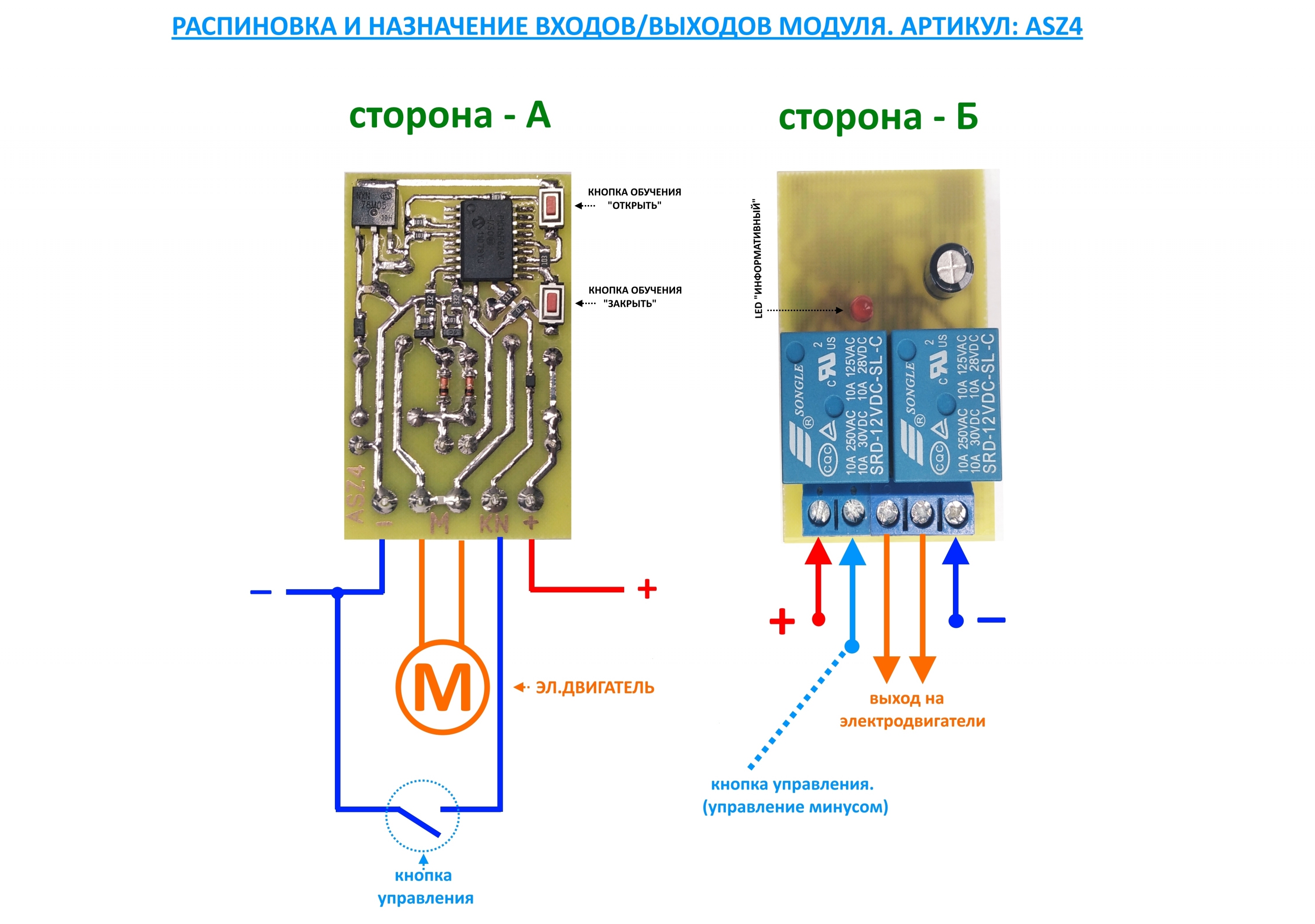 Підключення модуля. Модуль підключається згідно з наведеною нижче схемою, для підключення знадобиться всього лише п'ять проводів. Кнопка ручного керування потрібна будь-яка без фіксації з нормально відкритими контактами. Після підключення модуля за наведеною схемою, модуль треба навчити, а саме задати тривалість тимчасових сигналів керування на відкриття і закриття дзеркал. Для навчання на самому модулі є дві кнопки одна призначена для навчання режиму "Відкрити", а інша призначена для навчання режиму "Закрити". Примітка: "Відкрити" або "Закрити" це умовне поняття, вони можуть бути навчені і навпаки, адже модуль до навчання не знає, в який бік відкривається або закриваються дзеркала.