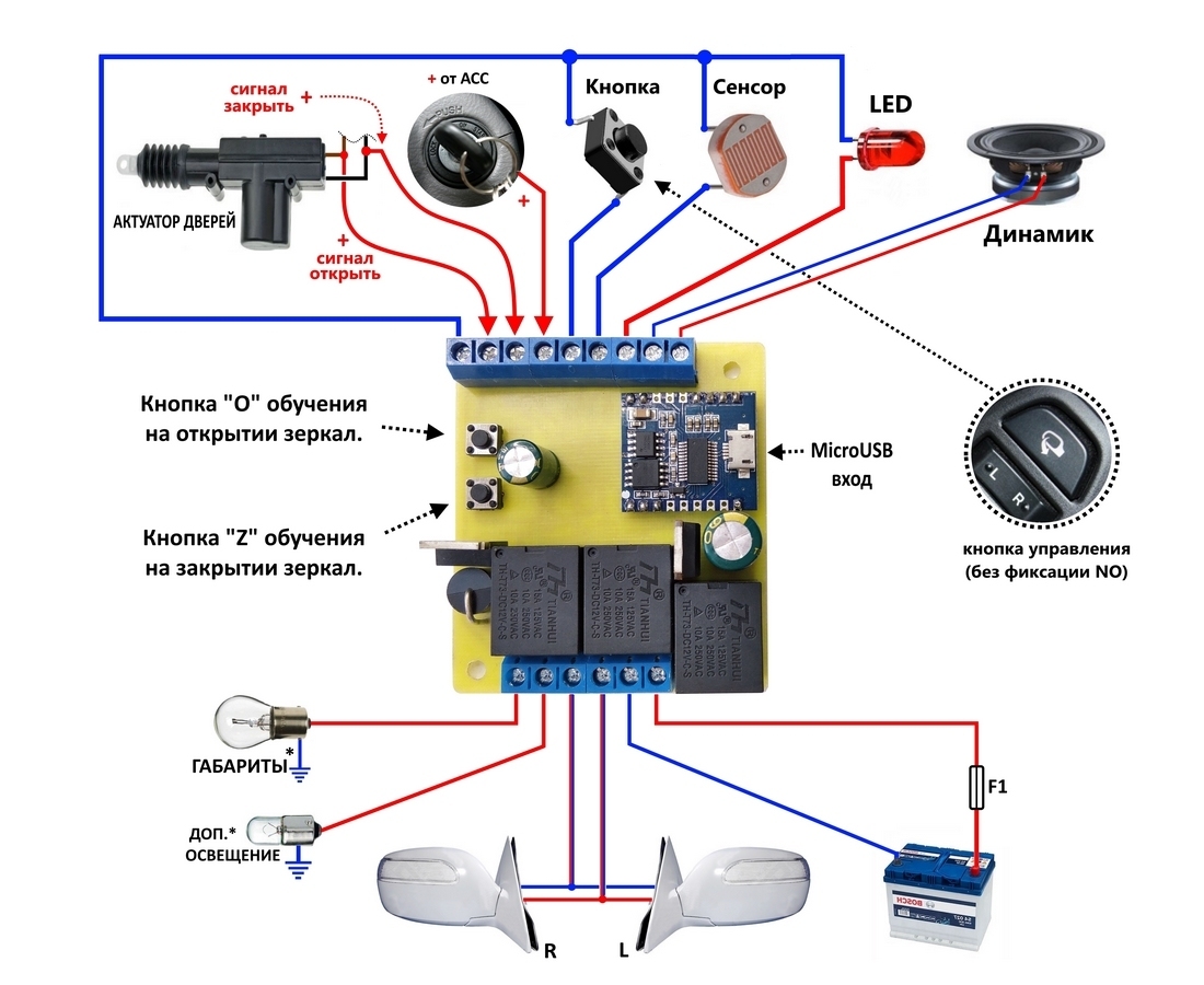 Модуль у роботі. Модуль підключається згідно з наведеною нижче схемою. Датчик освітленості треба встановити біля лобового скла або в іншому зручному місці, головне щоб знаходився біля скла, особливо це актуально на тих автомобілях у яких вікна дуже затемнені. Після підключення модуля за наведеною схемою, модуль треба навчити, а саме задати тривалість тимчасових сигналів керування на відкриття та закриття дзеркал. Кнопка ручного управління потрібна звичайнісінька і поширена, без фіксації, з нормально відкритими контактами, механічна, її ще називають тактовою.