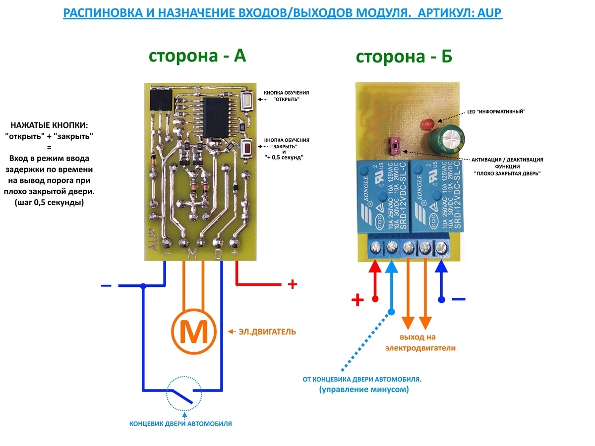 Підключення модуля та короткий опис. Модуль підключається згідно з наведеною нижче схемою, для підключення знадобиться всього лише п'ять проводів. Після підключення модуля за наведеною схемою, модуль треба навчити, а саме задати тривалість тимчасових сигналів керування на відкриття і закриття порогів. Для навчання на самому модулі є дві кнопки одна призначена для навчання режиму "Відкрити", а інша призначена для навчання режиму "Закрити". А також за допомогою одночасним натисканням кнопок "Відкрити" або "Закрити" можна зайти в спеціальний режим, в якому можна задати затримку за часом на виведення порогів при погано закритих дверях.