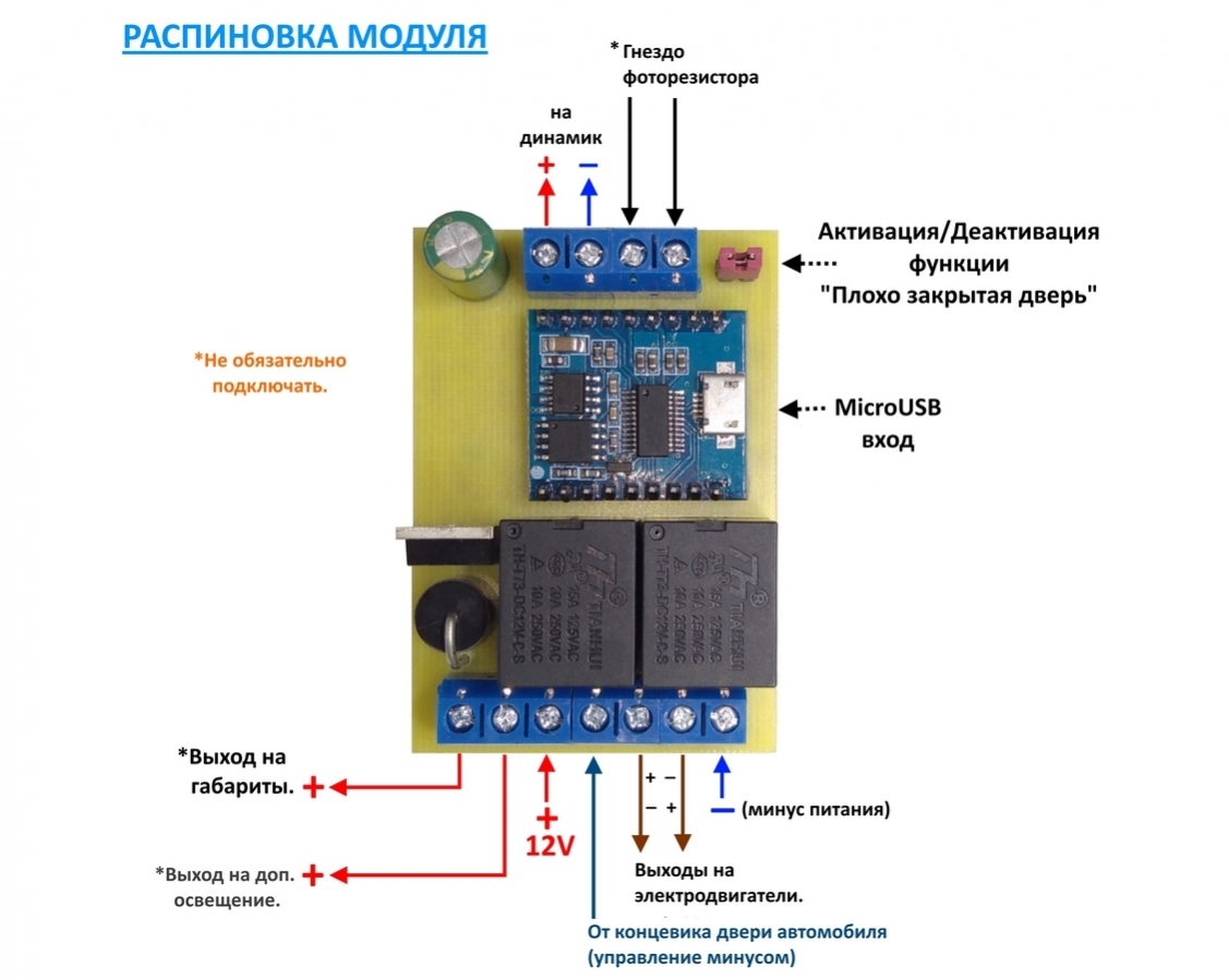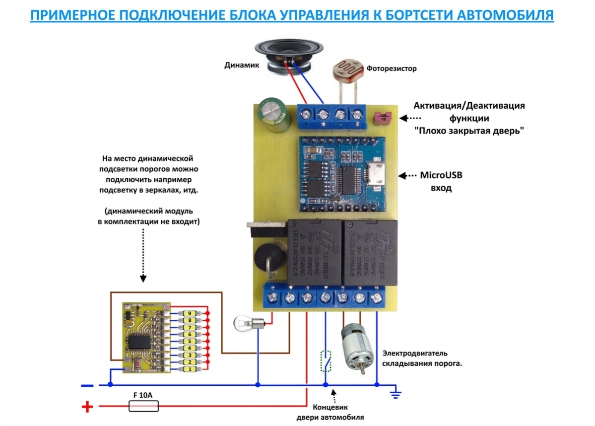 Ввічливе підсвічування. У цьому модулі є додаткова функція ввічливого підсвічування. Як датчик рівня освітленості застосовується фоторезистор. Його потрібно встановити десь в області бокового вікна або лобового скла, щоб максимально ефективно вловлювало рівень освітленості. При виявленні низької освітленості при відкритті дверей автомобіля увімкнеться габарити (навіть якщо вони у Вас були вимкнені), підключити відповідний провід від модуля до габаритів треба після автомобільного вимикача габаритів. Разом з габаритами при низькій освітленості ще включиться (якщо встановите) додаткове освітлення в дзеркалах що висвітлюватиме простір навколо порогів, або динамічне освітлення логотипу накладок порогів або самої підніжки - застосувавши спеціальний динамічний модуль артикул: AUPM як у відео (даний модуль артикул окремо).