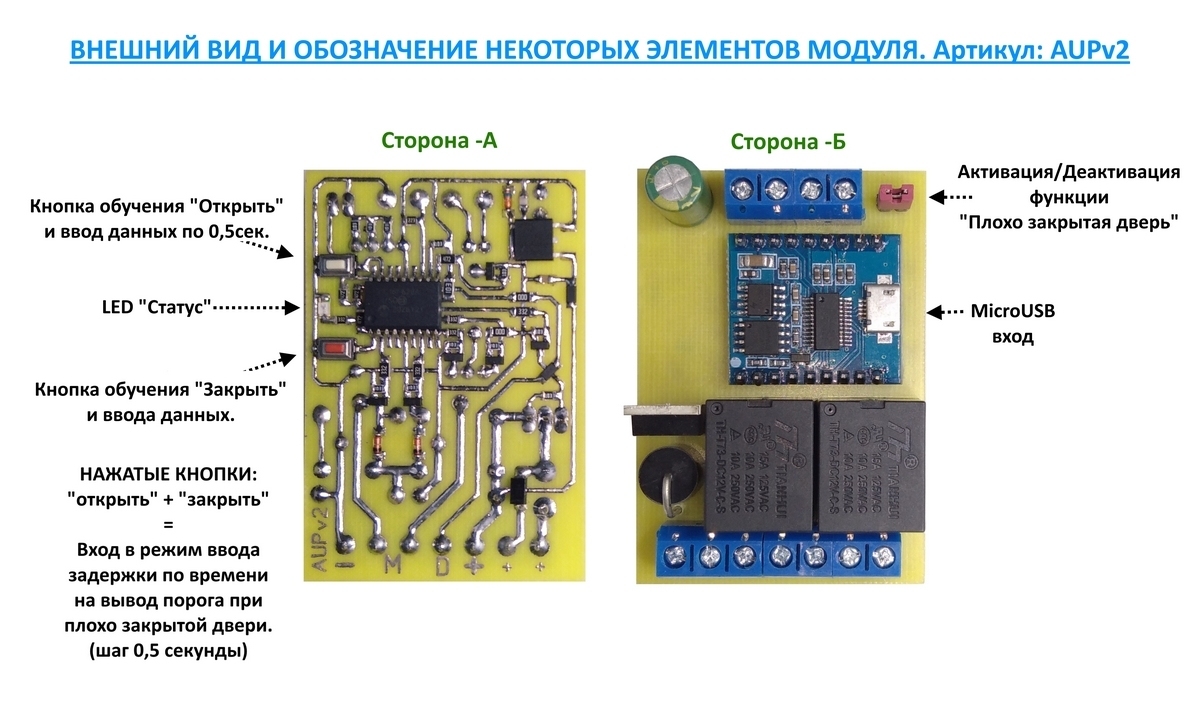 Навчання затримки часу на виведення порогів при погано закритих дверях. На знеструмленому модулі натисніть і утримуйте кнопки "Відкрити" i "Закрити" , не відпускаючи кнопки живлення. Після того як почне промаргувати 10 разів - відпускаємо кнопки. Тепер при кожному натисканні на кнопку "Відкрити" занесе в пам'ять 0,5 секунди (приклад: 0,5 - 1 -1,5 - 2 - 2,5 - 3 ітд), шляхом коротких натискань занесіть потрібну затримку. У модулі можна занести в пам'ять затримку в 10 секунд, при спробі занести затримку більше 10 секунд, модуль проморгне кілька разів світлодіодом у відповідь, повідомляючи, що ви задали максимально дозволену затримку, і запише в пам'ять максимальне значення в 10 секунд. Після занесення в пам'ять необхідної тимчасової затримки - натисніть один раз на кнопку "Закрити", модуль у відповідь підтвердить голосовим повідомленням успішне збереження даних до енергонезалежного частини пам'яті мікроконтролера. Модуль треба перезапустити, шляхом знеструмлення. Все, модулем можна користуватися.
