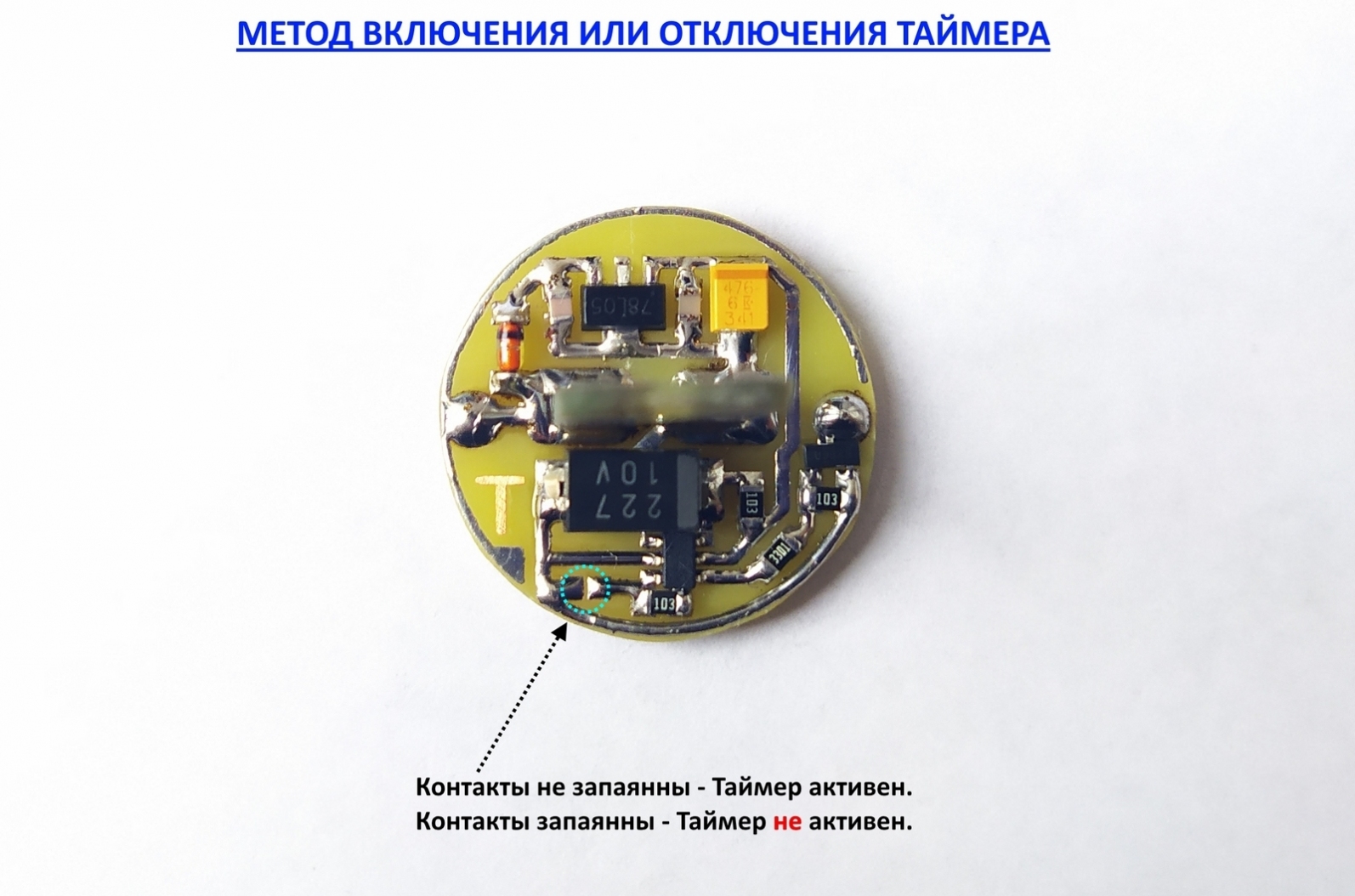 Опис роботи лампи: Встановлюється ця лампа так само, як і штатна. Коли відкриваєте двері відразу вмикається лампа морганням записаним у прошивці спецефектом і буде моргати до тих пір, поки не зачините двері, або по таймеру якщо двері залишилися відчиненими протягом більш виставленої в прошивці. Таймер можна деактивувати якщо не потрібен шляхом паяння двох точок на платі модуля лампи, місця пайки показані на фото, якщо захочете колись заново активувати таймер - потрібно знову розірвати контакт між цих двох точок. Модуль можна замовити у двох варіантів, з таймером на 5 хвилин або з таймером на 10 хвилин, (якщо при замовленні не вказали який варіант вам потрібен, то буде відправлений з таймером 5 хвилин). Ця лампа має ще одну функцію, негайного вимкнення, режим "Економії енергії" (У випадках коли знаходитесь на риболовлі або на природі і хочете довго залишити автомобіль з відчиненими дверима). Для того щоб активувалася ця функція треба: Відкрити двері, закрити назад, і заново відкрити протягом 6-и секунд, модуль активує цю функцію і лампа не включиться. Після того, як зачините двері, лампа деактивує цю функцію і перейде в штатний режим роботи.
