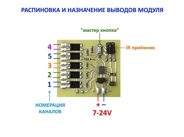 Більш універсального модуля, ніж цей, мені не доводилося зустрічати. Модуль навчається і працює практично з усіма пультами дистанційного керування (ПДУ). У модулі на кожен канал використовується оптрон, що дозволяє підключити виходи модуля безпосередньо до різних пристроїв (на замовлення можна зробити модуль з релейними виходами). Алгоритм роботи дозволяє налаштувати роботу від одного до п'яти каналів, як окремо, так і хоч всі канали на одну кнопку пульта. Також будь-який канал може працювати у режимі тригера, утримання чи перемикання. Команди можуть бути навіть змішані алгоритми буде працювати! У прошивці передбачено опцію збереження поточного стану виходів у разі збою живлення (працює тільки канали, що працюють у режимі тригера).