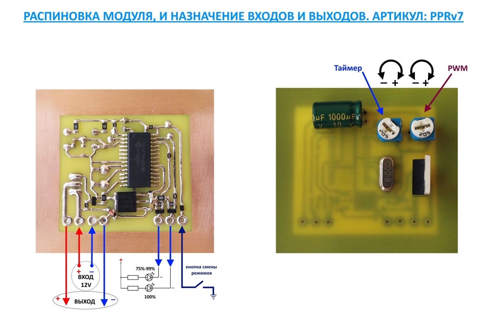 Налаштування таймера. Покрутіть потенціометр таймера і зупиніться в якійсь зоні, на вимкненому модулі натисніть кнопку зміни режимів і утримайте її натиснутою, подайте живлення на модуль не відпускаючи кнопку. Відпустіть кнопку, порахуйте кількість спалахів світлодіода, одне моргання це одна хвилині затримки таймера. Для додавання часу треба крутити за годинниковою стрілкою, для зменшення часу - покрутіть проти годинникової стрілки. Після цього повторіть процедуру, порахувавши кількість спалахів світлодіода. Після того як досягли потрібного результату модуль готовий до роботи.