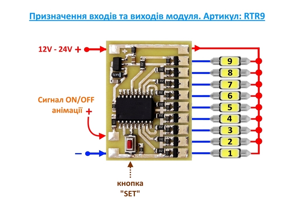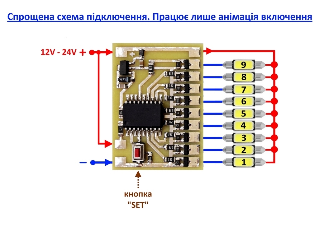 - За спрощеною схемою підключення (підтягнутий сигнальний вхід до плюса) модуль відтворює лише анімацію увімкнення — без анімації вимкнення.