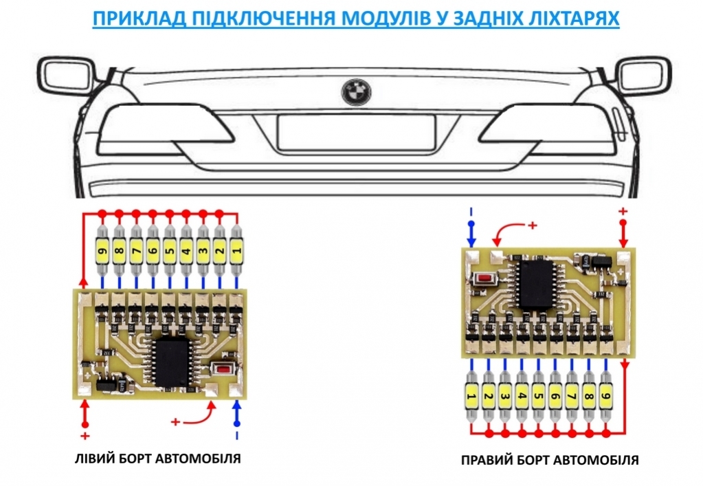 - Якщо сигнал зникає (наприклад, габарити вимкнені), модуль може відтворити анімацію вимкнення (зворотний порядок) — для цього необхідне джерело живлення, що дозволяє модулю «закінчити» послідовність при відсутності керування.