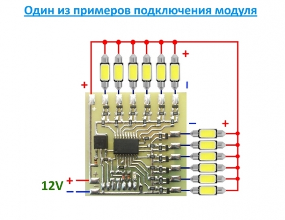 За допомогою цих двох налаштувань можна використовувати цей модуль для всіх марок автомобілів та для всіх типів реле поворотів. Для підключення модуля додаткові дроти не потрібно тягнути, що е дуже важливо. До виходів модуля можна підключати будь-які навантаження: прості лампочки, світлодіоди, ланцюги світлодіодів, світлодіоди та драйвери (стабілізатори струму).