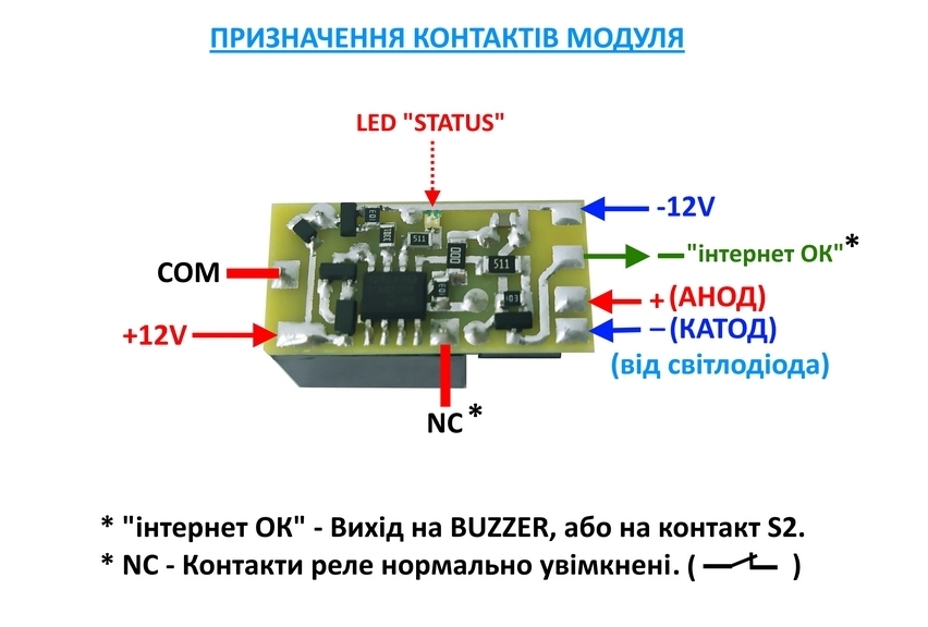 Вихідів: 2 (1 реле NC, та 1 інформаційний)