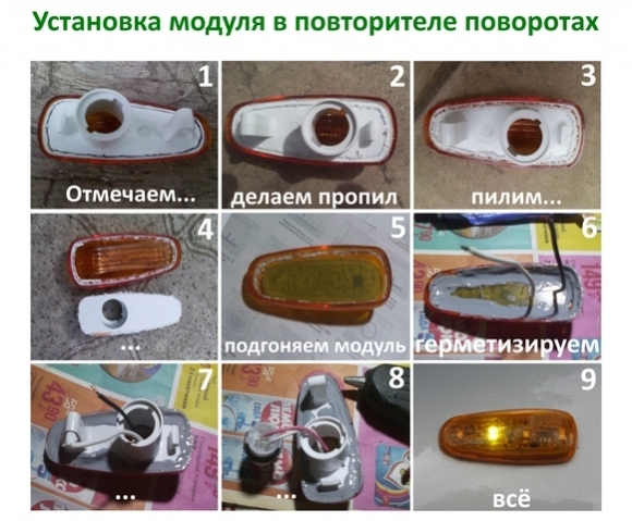 Динамічний або анімований повторювач повороту, 4 канали, мае 5 світлових ефектів (сцен виконання), та 5 швидкостей виконання. Для підключення модуля додаткові дроти не потрібно тягнути, що дуже важливо. Вихідні ключі використовуються потужні на 2 Ампера на кожен канал. Світлодіоди, що використовуються в модулях потужністю 0,5 Ватт. Можна замовити модулі у двох варіантах: З безбарвними світлодіодами – якщо у Вас повторювач повороту має жовтий або помаранчевий корпус. Або з жовтими світлодіодами – якщо у Вас прозорий корпус повторювачів поворотів. Цей модуль вбудовується в існуючі повторювачі автомобіля, метод переробки показаний в картинках. Після обробки всі місця повторювача треба герметизувати, для цього підійде: Герметик, силікон, водонепроникний клей,