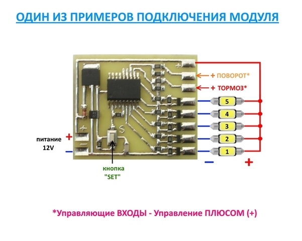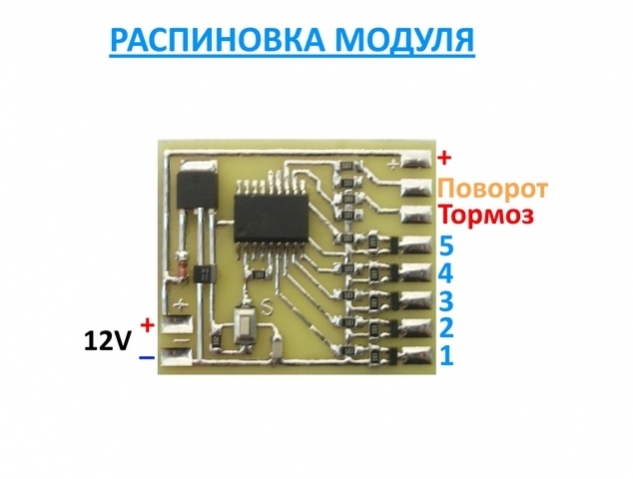 Модуль був розроблений під індивідуальне замовлення автомобіля одного клієнта. Завдання замовлення було в тому щоб об'єднати стоп і поворот, зробити його 5-ти канальним, при натисканні на гальмо всі канали повинні просто включиться, а при включенні повороту повинна з'явиться динамічна (анімована) індикація сигналу повороту (лінійка, що заповнюється) у бік повороту . При цьому поворот має пріоритет перед індикацією стоп (гальмування), коли на модуль надходять обидва сигнали, щоб створити чітку стандартну паузу між динамічною індикацією поворотника. У прошивці вставлена ​​функція ігнорування сигналу стоп, поки працює поворотник, ця пауза в 2 секунди після останнього моргання (у прошивці значення можна зменшити або збільшити). На модулі знаходиться кнопка "SET",