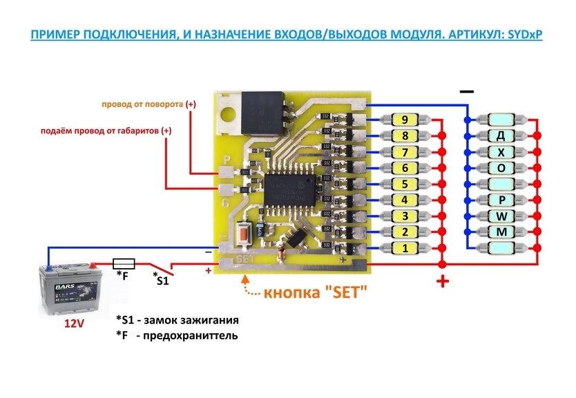 Нова версія 9-канального динамічного поворотника, плюс окремий канал для ДХО (денних ходових вогнів), канал ДХО регулюється в межах від 0% до 100%, з кроком 2%. Це потрібно для того щоб мати можливість виставити необхідну яскравість свічення ДХО під час роботи поворотника, а також якщо під час роботи поворотника можна виставити 0% яскравості свічення каналу ДХО - в тому випадку якщо ви не хочете щоб під час роботи поворотника світилися ДХО. А також модуль вміє плавно включати ДХО. До цього контролера можна підключати до 9 світлодіодів, або до 9 ланцюжків світлодіодів. Можна й менше. На контролері із транзисторів на світлодіоди виходять мінуси. Плюс на світлодіоди приходить загальний. До виходів модуля можна підключати будь-які навантаження: прості лампочки, світлодіоди, ланцюги світлодіодів, світлодіоди та драйвери (стабілізатори струму).