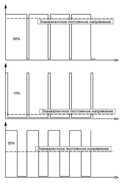 Широтно-імпульсна Модуляція - це спосіб кодування аналогового сигналу шляхом зміни ширини (тривалості) прямокутних імпульсів несучої частоти. Рис. 2 представлені типові графіки ШІМ сигналу.