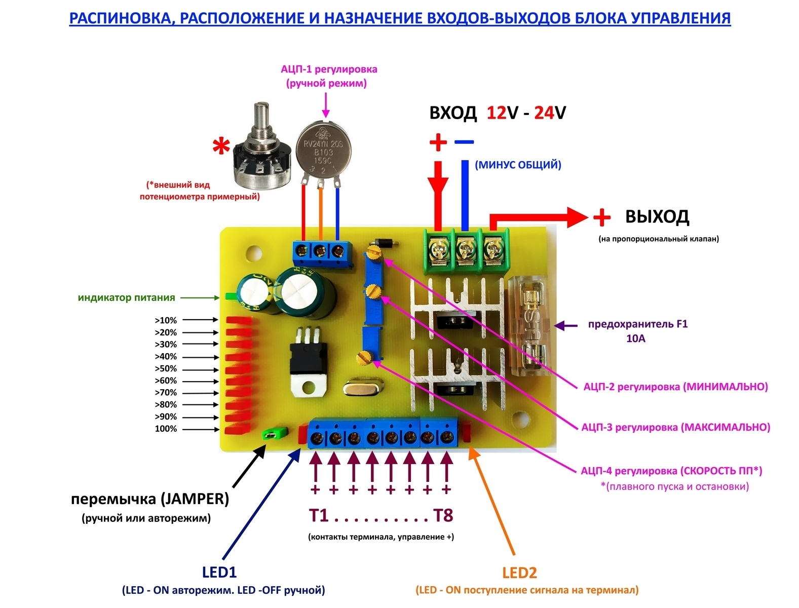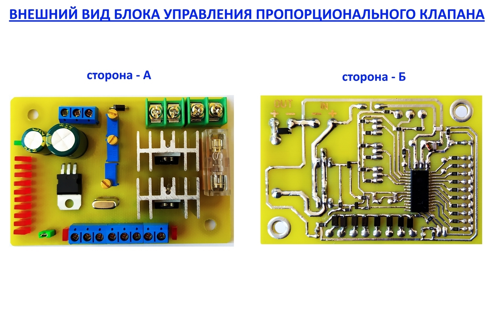 Всі регулювання робляться шляхом прокручування викруткою гвинтиків багатообертових резисторів для точного налаштування параметрів. Прокручування за годинниковою стрілкою – збільшує параметр, прокручування проти годинникової стрілки – зменшує параметр. Після налаштування трьох параметрів АЦП модуль готовий до роботи. Клапан потрібен саме пропорційний (ну це й так зрозуміло), адже звичайний електроклапан має лише два стани: відкритий та закритий. Модуль має захист від переплюсування, неправильної подачі живлення.