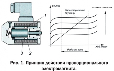 У цьому пристрої (мал. 1), на відміну від дискретних електромагнітів постійного струму, передбачена конусна вставка 1 з немагнітного матеріалу, що змінює форму ліній магнітного поля. В результаті керуючий струм у котушці 2 створює електромагнітне поле, що викликає зміщення феромагнітного якоря 3 з силою пропорційної силі струму. Якір взаємодіє з підпружиненим запірно-регулюючим елементом гідроапарата (золотником, конусом запобіжного клапана, втулкою дроселя), причому накладання лінійної характеристики пружини на силову характеристику магніту показує, що осьове зміщення (хід) якоря пропорційне току управління. Управління пропорційним електромагнітним клапаном проводиться за допомогою електронної схеми управління з ШІМ сигналом, і досягається за рахунок широтно-імпульсної модуляції.