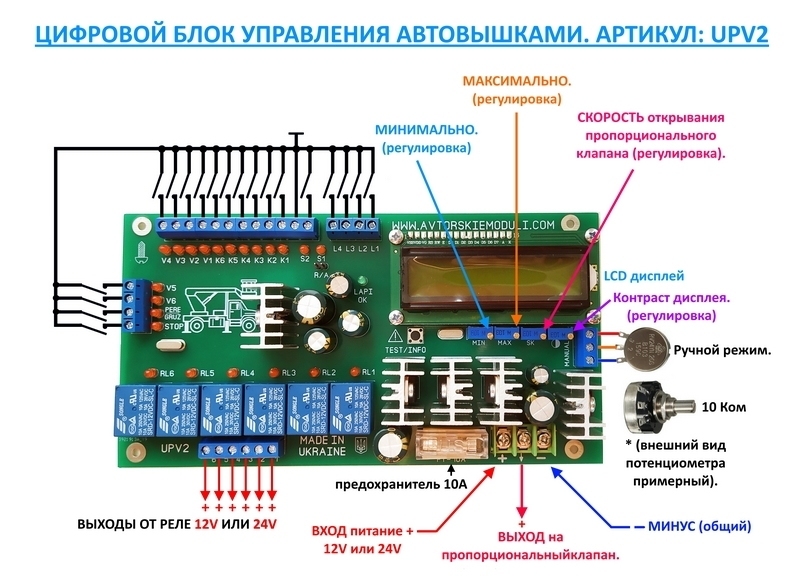 Цей блок керування є новою версією вже існуючого блоку керування автовишкою (артикул: UPV), і буде випускатися тільки на платах у заводському виконанні, ця нова версія вже має дисплей LCD на якому виводиться важлива інформація в реальному часі про параметри роботи пропорційного клапана та стану опор. Як виглядатиме цей блок керування, можете побачити на зображенні нижче. Блок керування універсальний та може бути використаний не тільки на автовишки - але і на іншій спецтехніці, де принцип керування такий самий. Блок керування управляє шістьма звичайними клапанами через реле, і одним пропорційним безпосередньо (всього сім клапанів). Коли ви подаєте якусь команду - відкривається звичайний клапан, плюс пропорційний, пропорційний у свою чергу і виконує функцію плавністю рухів у автоматичному та у ручному режимі. За допомогою цього блоку управління можна "оживити" поламану техніку і вона почне працювати знову. Блок управління не може повністю і точно як оригінал замінити ваш блок управління, сподіваюся що ви і так це розумієте, він є спрощеною версією і аналогом - але ніяк не копією оригіналу.