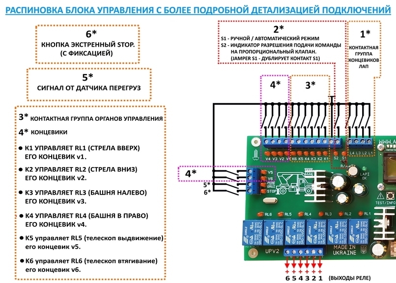 Для переведення управління модуля в автоматичному режимі, треба на платі встановити перемичку (JAMPER) або включити тумблер S1, як тільки встановіть перемичку поруч з ним світиться світлодіод S1, сигналізуючи вхід в автоматичний режим управління, плавне зростання ШІМ сигналу почнеться в той момент коли на Будь-який контакт терміналу K1-K6 надійде мінус живлення від команд управління спецтехніки. На терміналах є діодна розв'язка. Коли автоматичний режим активний - перший канал АЦП вимкнено, і на нього мікроконтролер не реагує, але активний четвертий канал АЦП, яким можна відрегулювати швидкість зростання ШІМ сигналу. Другий і третій канал АЦП активні як і ручному, і у автоматичному режимі. У ручному режимі, навпаки, Перший-другий-третій канал АЦП активні, а четвертий відключений. Для підключення ручного режиму - треба видалити перемичку (JAMPER) або вимкнути тумблер S1 з плати, при цьому світлодіод S1 згасне. При спрацьовуванні вашої системи безпеки по перевантаженню та надходженню сигналу на модуль, спрацює закладений алгоритм запобігання перекиданню автовишки, і будуть заборонені та ігноровані подача керуючих команд. Як тільки рештою команд повернете стійкість спецтехніки і сигнал перевантаження більше не надійде на модуль - будуть знову доступні всі шість команд управління. За бажанням клієнта можу зробити зміни у прошивці та прописати до списку заборони подачі команд ВЕЖА НАЛІВО та ВЕЖА ВПРАВО, коли надходить сигнал перевантаження.