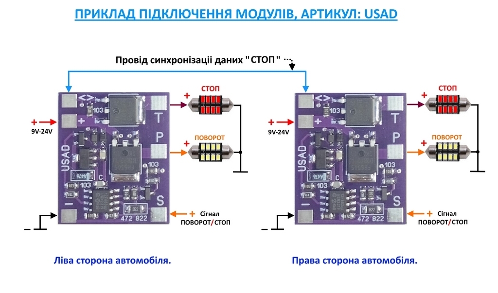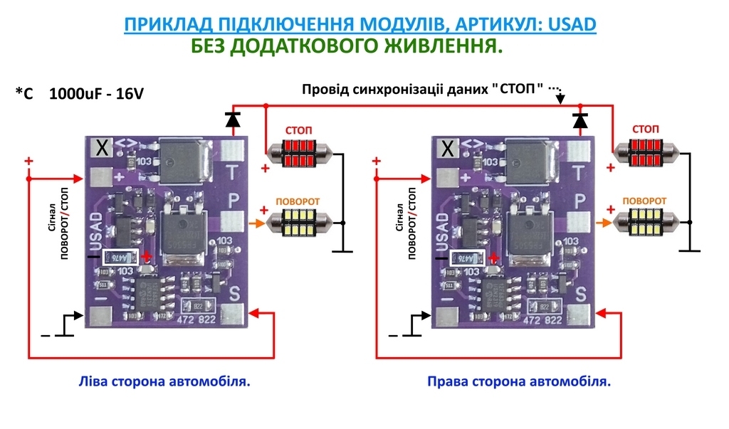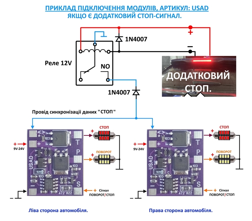 Модуль універсальний і може бути встановлений як на ліву, так і на праву сторону автомобіля. Якщо не підключено провід синхронізації між модулями, сигнал гальмування буде відображатися лише на тій стороні, куди він надходить.