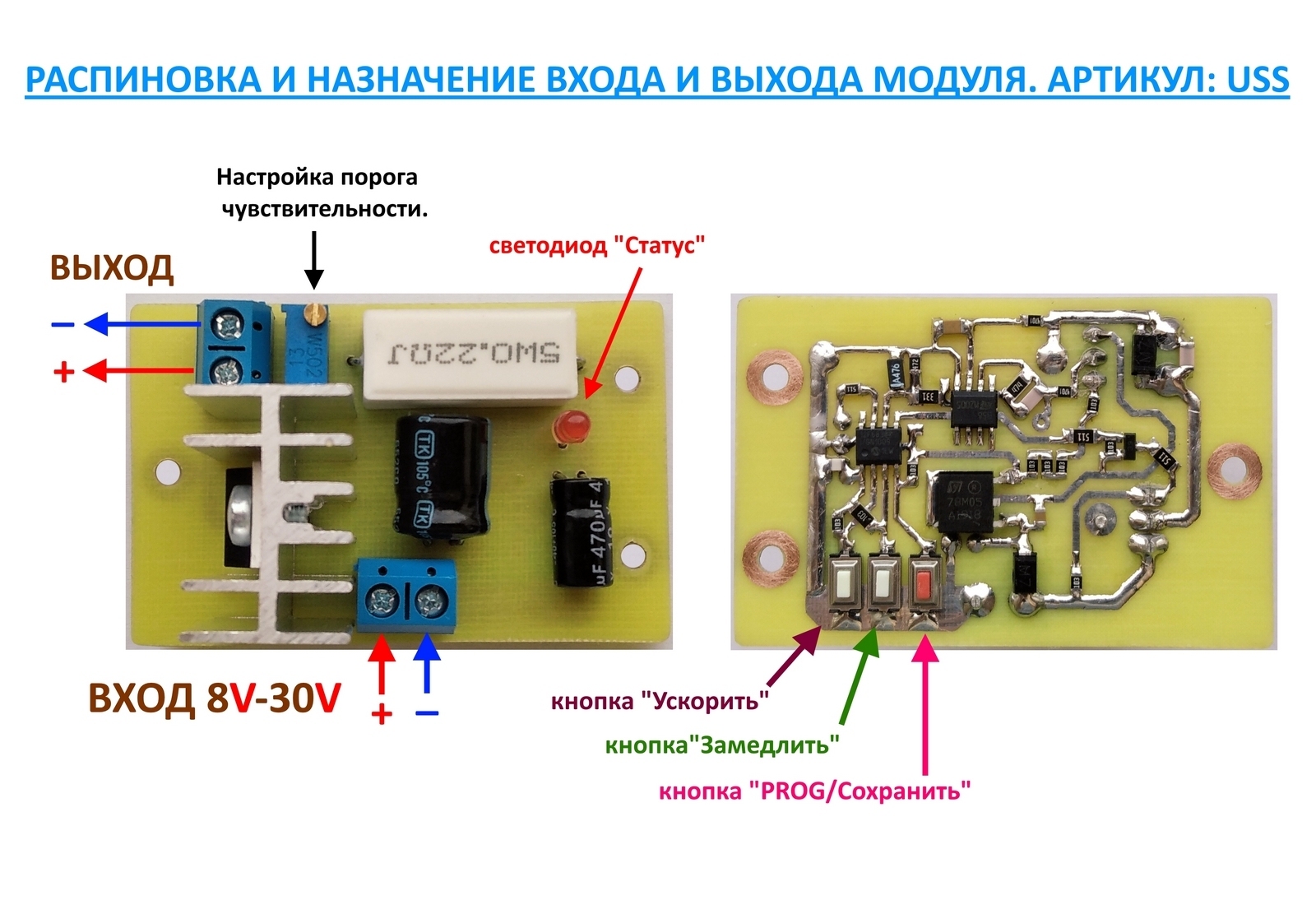 Навчання модуля. Підключаємо модуль за наведеною схемою, перед першим включенням треба навчити модуль. До подачі живлення, натисніть та утримуйте кнопку "PROG/ЗБЕРІГТИ". Подайте живлення на модуль, не відпускаючи кнопку. Світлодіод "Статус" промигає 5 разів. Відпустіть кнопку "Зберегти". Відразу почне працювати електродвигун. Довгими натисканнями або одиночними натисканнями кнопкою "Прискорити" або кнопкою "Уповільнити", виставте максимальну прийнятну швидкість обертання електродвигуна. Натискання кнопок супроводжуються миготіннями світлодіодом, кожне миготіння - це один крок, всього для регулювання від 0% до 10% використовуються 255 кроків. Коли ви доходите з регулюваннями швидкості в крайніх точках - світлодіод перестає блимати. Для збереження максимальної швидкості обертання електродвигуна просто натисніть один раз кнопку "PROG/Зберегти", при збереженні світлодіод проморгне 10 разів у відповідь, підтверджуючи успішне збереження налаштувань. Після збереження параметрів модуль переходить у робочий режим. У робочому режимі вже можна регулювати мінімальні необхідні оберти обертання електродвигуна, для цього вже не треба відключати живлення, а можна відразу "на гарячому" зробити налаштування за допомогою кнопок "Прискорити" і "Уповільнити", і збереження налаштувань так само відбувається при одному натисканні на кнопку "PROG/ЗБЕРІГТИ", при збереженні світлодіод проморгне 10 разів у відповідь. Усе, модуль налаштований.