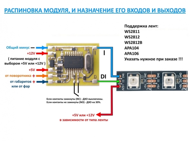 Модуль додаткових настроювань не потребує, підключаємо і користуємося. На модулі є контакти для вибору дій, які повинні відбуватися при включенні габаритів або фар (залежно куди підключилися), із замкнутими контактами - ДХО OFF, з не замкнутими контактами ДХО 30%, замикати контакти можна краплею припою або можна підключити до контактів дроту та вивести їх у зручному місці підключити наприклад до тумблера або до кнопки з фіксацією, таким чином можна швидко змінити налаштування ДХО якщо зміниться переваги в майбутньому. Єдине на що потрібно звертати увагу це те - коли підключите живлення на модуль +5V, не перевищуйте це значення! На вхід +12V можна подавати до +24v. Живлення адресної стрічки і модуля краще реалізувати на DC-DC перетворювача відповідної потужності (краще брати із запасом за потужністю, що видається). Для збільшення яскравості стрічки можна підключати кілька стрічок, підключених паралельно.